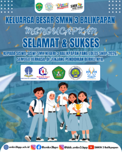 Keluarga besar SMK Negeri 3 Balikpapan mengucapkan selamat dan sukses kepada seluruh siswa-siswi yang telah berhasil lolos Seleksi Nasional Berdasarkan Prestasi (SNBP) Tahun 2026.